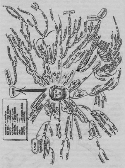 Выгод, предоставляемых интеллект-картой при подготовке выступления или при написании статьи, можно указать по меньшей мере две: ничем не ограниченное «ветвление» мыслей оказывает на автора постоянное благотворное действие, стимулируя его к поиску новых, все более смелых идей; в то же время система ключевых слов и образов позволяет гарантировать, что за завесой устного или изложенного на бумаге слова пи один важный пункт не будет упущен,