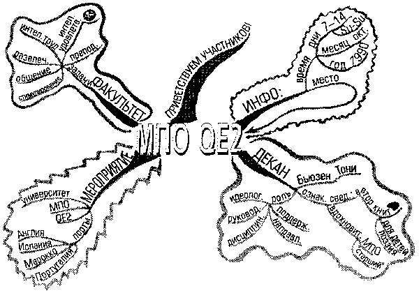 На одном из семинаров нескольким группам были розданы листы бумаги с нанесенным на них «скелетом» интеллект-карты (см. ниже), после чего каждой группе предложили коллективными усилиями наполнить карту конкретным содержанием по своему усмотрению. Вот что рассказали о результатах этой работы Джим Мессершмит и Тони Мессина, директора проектов и зачинатели внедрения метода интеллект-карт в «ЭДС»:
