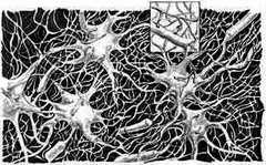 Иллюстрация, демонстрирующая связь нейронов между собой. Рисунок упрощен тысячекратно и соответствует микроскопической части мозговой ткани.