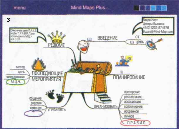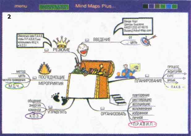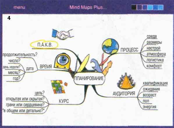 Иллюстрация XXIII: 1: Иконка в виде книги рядом с ключевым словом ВВЕДЕНИЕ означает, что имеется текстовое приложение. 2: Стрелки указывают на дополнительные слои информации, не поместившиеся на экране. 3: Иконка в виде страницы текста означает гиперссылку на дополнительную интеллект-карту. 4: Интеллект-карта «ПЛАНИРОВАНИЕ», связанная с основной интеллект-картой гиперссылкой.