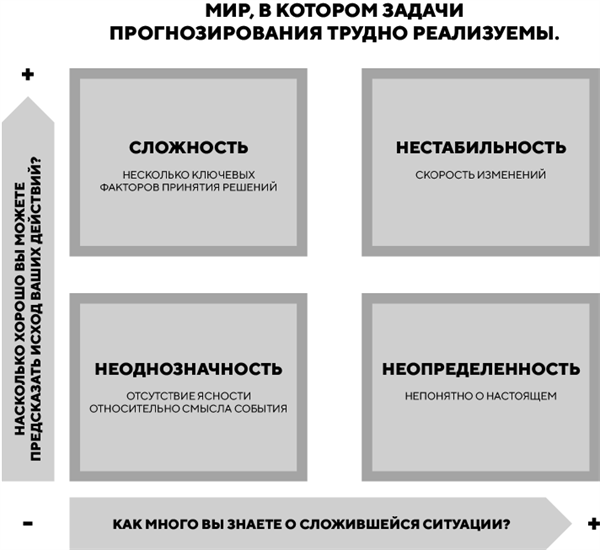 В наши дни большую популярность приобрел термин VUCA, и неслучайно он применяется в экономике, бизнесе и других сферах. Это понятие образовано от английских слов Volatility («изменчивость, отсутствие стабильности»), Uncertainty («неопределенность»), Complexity («запутанность, сложность»), Ambiguity («неясность, неоднозначность»). Данный термин используется для того, чтобы, во-первых, обозначить наличие неопределенности и быстрой изменчивости всех явлений в настоящем мире, и, во-вторых, акцентировать внимание на том, что понимание и принятие реальной ситуации позволяют приспособиться к ней и выработать стратегические и управленческие решения в соответствии с тенденциями.