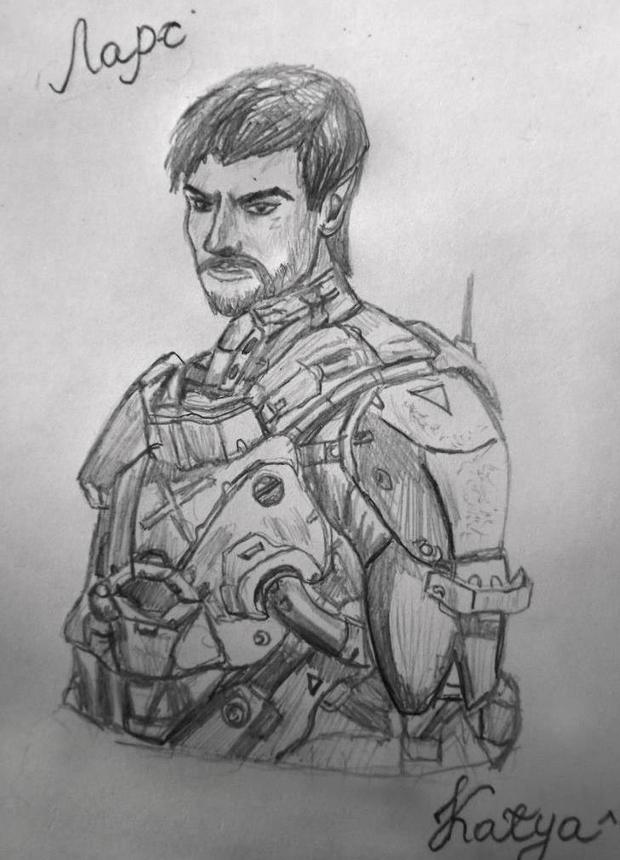 Развернувшись, увидел направляющегося ко мне дрона. К слову, я знал много модели, но подобную машину видел впервые. Это был некий гибрид гражданской и боевой модели. В левую руку вмонтирован фронтальный щит, в правую дуговой излучатель. Лицевой дисплей — экран с изображением как бы «прищуренных» глаз. Отдельно стоит выделить некое подобие плаща с капюшоном, но без рукавов прямо поверх брони.