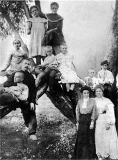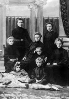 Стоят:Михаил, Вера; сидят:Варя, Варвара Михайловна с Колей, Надежда; в нижнем ряду:Леля и Иван