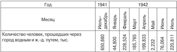 Учетные данные о движении населения через станцию и пристань Череповца (этот город являлся первым крупным населенным пунктом региона на пути движения), представленные в табл. 1 и 2, показывают, что процесс эвакуации в область по степени интенсивности разделяется на несколько этапов. I этап: июль 1941 – январь 1942 г., когда ежемесячное количество приезжающих граждан было примерно равным. II этап: февраль – апрель 1942 г., для которого характерно резкое увеличение интенсивности потока по сравнению с предыдущим этапом. В мае 1942 г. масштабы эвакуации значительно снижаются. III этап: июнь— октябрь 1942 г. – время интенсивной эвакуации, при этом самая высокая интенсивность потока населения относится к июлю 1942 г., после чего происходит постепенное снижение. IV этап: ноябрь 1942 – март 1943 г.: устойчивое снижение численности эвакуируемого населения. 1 апреля 1943 г. властями было принято решение о закрытии эвакопунктов из-за прекращения массовой эвакуации [247] .