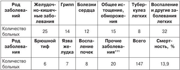 О характере заболеваемости жителей блокадного Ленинграда, остающихся в Вологодской области, дает представление сохранившаяся учетная документация. В табл. 5 указаны данные за 1941 – начало 1942 г. На этом этапе относительное большинство пациентов (17 %) составляли люди с желудочно-кишечными заболеваниями, в частности дизентерией, что могло быть вызвано плохими условиями и режимом питания до переезда, недостаточно хорошо организованным питанием во время переезда. Дистрофики в эту категорию пациентов не входили. У многих эвакуированных граждан были проблемы с сердцем, воспаление и другие заболевания легких, грипп. Лиц с обморожениями, дистрофиков, пациентов с язвой желудка и туберкулезом было очень мало. В это время блокада уже началась, но условия проживания в Ленинграде еще не были такими ужасающими [348] .