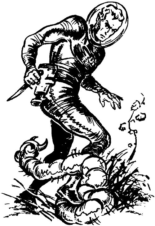 Фу, надо отдышаться. Уже успел пережить небольшое приключение. Вдруг почувствовал, как что-то резко кольнуло в щиколотку правой ноги, дернуло в сторону. Оказывается, вцепилась мертвой хваткой какая-то мерзкая тварь - длинное членистое тело, покрытое жесткой рыжей щетиной, когтистые бесчисленные лапки, громадные челюсти… Отвратительный гибрид сороконожки и скорпиона. К счастью, костюм выдержал. Пришлось взяться за нож - пистолет пускать в действие опасно, можно и себя поранить. С немалым трудом отодрал от себя полуметровую гадину, которая оказалась необычайно живучей - даже разрубленная на части продолжала метаться в траве - и угрожающе щелкать костяными челюстями. Да, надо поглядывать не только по сторонам, но и под ноги…