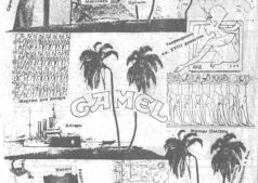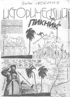 Ниже этого текста — фигурки, изображающие пять молодых и пять старых мужчин, стоящих спиной друг к другу. Между ними какое-то странное слово (непонятно, что оно означает по-русски) — «чурики». На каждой картинке, на первом плане — по две пальмы (на первой — верхней, одна пальма закрыта рисунком). Пикник почему-то назван «им. Артемиды», а на второй сверху картинке — с дельтой Нила, к руслу реки зачем-то добавлен рукав с названием «Ниловна». На центральной — третьей картинке — крупными буквами выведено знакомое в Англии название сигарет «CAMEL»; справа от этой надписи из экрана телевизора вылезла фигурка в облачении древнеегипетского фараона, под ним восемь фигурок с надписью — жрецы ОМОНа. Другие надписи, типа «Казармы, ведущие в Рим», колхоз «Александрийский маяк», «Саркофаг с прошлым фараоном», «Колосс Родосский». Короче: картинки и надписи к ним были полны вздора, которому нет места ни в истории, ни в географии, если всё это пытаться понять в прямом смысле. Но сколько я ни пытался сложить из этих странных «камней» хоть какую-то связную мозаику, в которой бы проявился скрытый смысл «пикника», у меня ничего не получалось. Не хватало ключей к этому ребусу: скорее всего, — знания событий, относящихся к истории России и Египта.