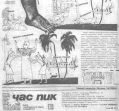 Первая ступень правой диагонали-лестницы начиналась с календарного сообщения, привлекшего мое внимание при первой встрече с третьим «пикником». Справа к календарному сообщению примыкала башня со звездой (меньше Спасской башни) и под всем этим стояла надпись — «Слуховой аппарат ЦК». Ступенькой выше — две надписи: «Лежбище коммунистов» и «Большой цирк Шапиро»; еще ступенькой выше по правой диагонали — знакомая фигура военного из «Оборонного пикника» с маской — респиратором. На следующей ступени — две скульптурные группы борцов (где-то я их видел?) с надписью «Обмен точек зрения». Таким образом, «Место важнейших тусовок» действительно становилось местом пересечения лестниц-диагоналей, выше которого по левой диагонали сидела обезьяна с вытянутой правой лапой, а над ней, на фоне «Лебединого озера» (так почему-то был назван залив, на берегу которого расположился Петербург) — физиономия с выпученными (то ли от страха, то ли для устрашения) глазами, под которой надпись — «Большевистские штучки».