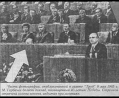 Перестройка-обрезание Российской империи в границах СССР началась при Горбачёве и это неблаговидное дело сразу же «случайно» отобразилось в мифологическом символе — половине черепа «прораба перестройки», выставленного на всеобщее обозрение более чем 200 миллионам граждан Советского Союза в священный праздник почти всех русских во всём мире — День Победы над фашизмом, который в середине двадцатого столетия отождествлялся с германским нацизмом. Что могло означать появление этого символа на первой странице одной из самых многотиражных газет СССР?