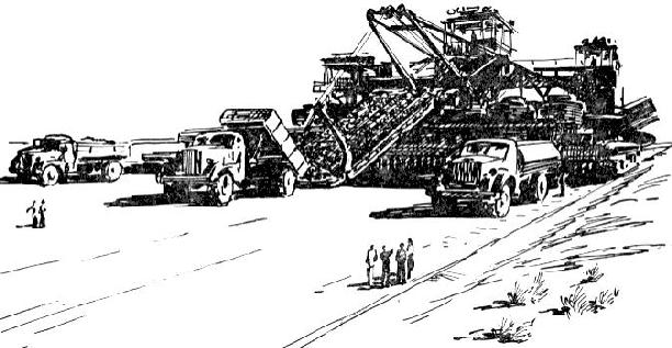 Затем следовала машина, похожая на «сеялку», но вместо сошников здесь вибрировали металлические иглы — в несколько рядов, как щетка. Это была поливальная машина, или, вернее, смеситель, так как машина не только увлажняла песок и цемент, но и перемешивала получающуюся массу.
