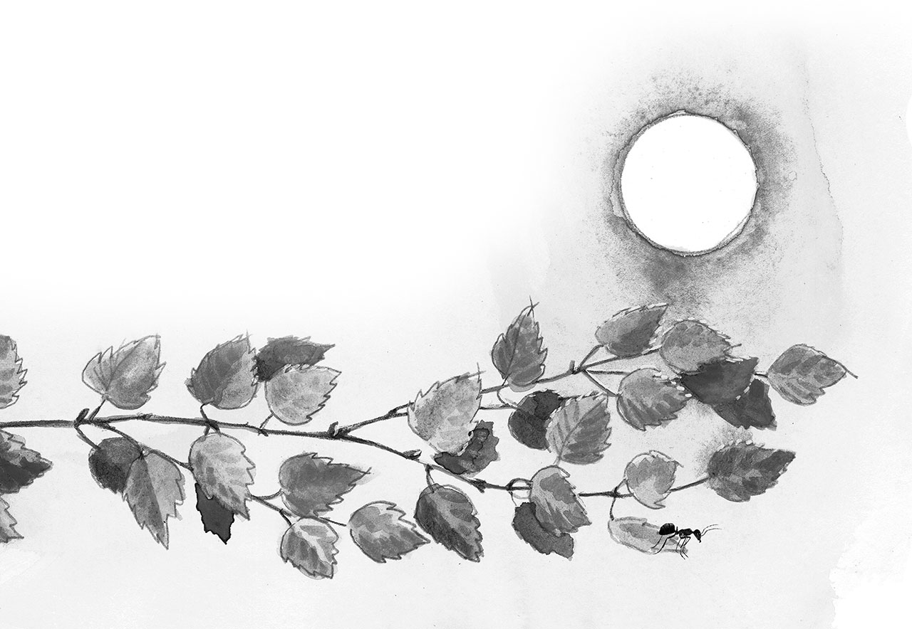 Залез Муравей на берёзу. Долез до вершины, посмотрел вниз, а там, на земле, его родной муравейник чуть виден.