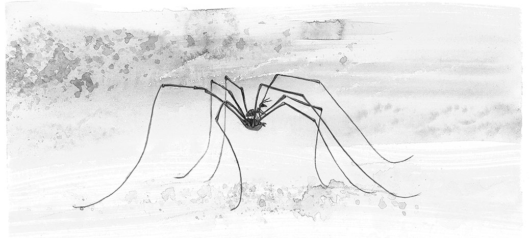 Оглянулся, видит: луг впереди, на лугу трава скошенная лежит. А по лугу Паук-Сенокосец шагает: ноги, как ходули, между ног голова качается.