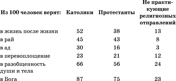 Опрос, проведенный в Европе в 1981 году (конец второго тысячелетия), касался верований населения, классифицируемых согласно различным конфессиям (Источник: Жан Штотцель. Ценности текущей эпохи. Издательство Французского университета, 1983.).