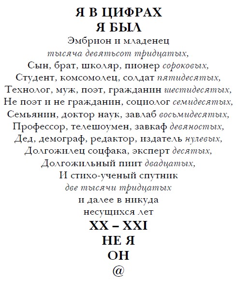 В 1970–93 гг. я заставил себя погрузиться в поэтическое «немо», отвергнув лирическое самовыражение. Я выбрал литературное молчание, но не впал в мистику, как младший брат, и не стал диссидентом, а потом эмигрантом, подобно другому, рано умершему брату. В конце 60-х я отверг стихосложение – и в качестве способа снятия моих стрессов и как средство социологической самореализации. Исходя из сложившейся ситуации, выталкивавшей меня за пределы литературного сообщества, пришлось переключиться на научную сублимацию и тем самым как бы вновь найти, обрести себя – в роли социолога. Погружение в среду социолого-демографических исследований, в социологию «семье-населения» – самую мирную из невоенных наук – позволило искать и находить правду научных фактов, судить о ней вслух и в статьях и монографиях, защитить кандидатскую и докторскую диссертации, стать специалистом и экспертом, а также популяризатором науки в СМИ и на ТВ.