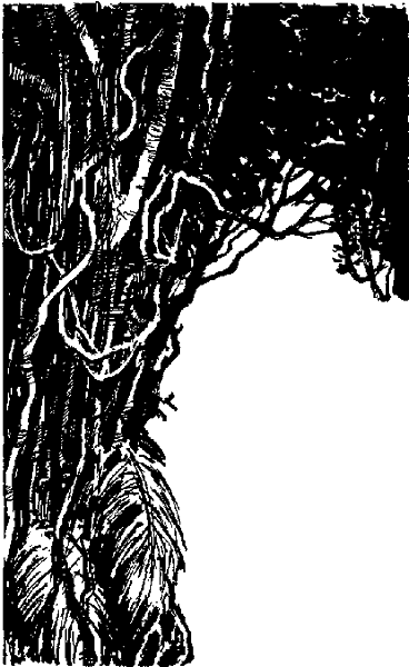 Лианы! Когда-то деревья этого сказочного леса вздумали бунтовать и кто-то усмирил их, обвязав канатами из лиан и соорудив из них решетки и отсеки. Лианы стелются по земле, взбираются на стволы, перебрасываются с ветки на ветку, с одного дерева на другое, снова сползают на землю, исчезают в чаще. В этой путанице невозможно найти ни начала, ни конца. Гирлянды и фестоны уже тысячи лет дожидаются своего сказочного принца, дожидаются, но, увы, тщетно. С почтенного дерева кимали свисают лианы, похожие на изорванные жилы великана. Глядишь на них, и становится не по себе. Иные предательские лианы так крепко опоясали стволы, что деревья, задыхающиеся в этих смертельных объятьях, спустя несколько лет погибают. На их трупах разрастаются новые лианы и позднее сами превращаются в деревья — это фикусы.