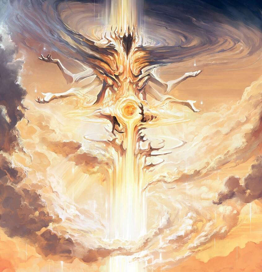 Наконец, Системный кинжал вынырнул на стороне насекомых, и я с облегчением разорвал связь с Рафирой, закрывая Разлом. Однако мое сновидение так и не закончилось. Огромная ручища все-таки пробила себе дорогу, разорвав светящуюся оболочку, без особых усилий разбила Абсолютный щит, которым я пытался ее удержать, а заодно и ставшие бесполезными каменные ладони. Вслед за ней выросла еще одна конечность, а затем еще и еще, пока их число не достигло шести. Две ладони прикрывали огненную сферу, служившую ему якорем в моем мире, остальные удерживали на весу какие-то светящиеся снаряды. На землю обрушился столп невыносимо яркого света, а в небеса устремились клубы едкого дыма от пылающего туловища исполинского чудовища, которое протиснулось в отверстие червоточины вслед за руками. Последней появилась увенчанная короной голова, представлявшая собой сплошную маску, над которой тоже возник столб света, бьющий в небеса.