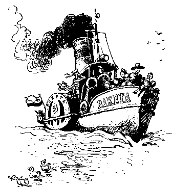 Важный капитан с черными усищами сидит в своей будочке за штурвалом. На капитане форменная, настоящая морская фуражка с золотой эмблемой. Спасательные круги, ведра, выкрашенные в белую краску, развешаны вдоль палубы. На самом носу — свернутые кольцами канаты необыкновенной толщины. Матросы в полосатых тельняшках деловито проходят по палубе.