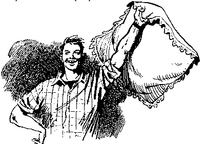 — Так, пирожки — очень хорошо! Колбаса — еще лучше! Шерстяной платок совершенно не нужен! А это что, подушка? Товарищи, видели? — Он высоко поднял над головой большую подушку в белой с кружевами наволочке.