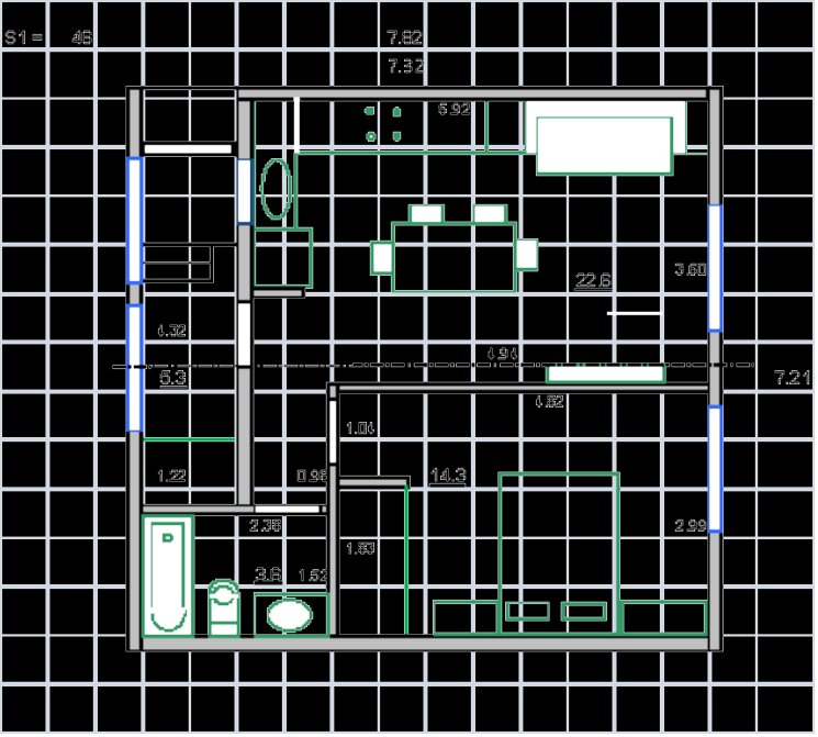 Я же исходил от универсального модуля Слот 2, разработанного и реализованного для более достойного жилья (135 кв. м) в Алмате 2013, но всего поменьше и попроще. Ну как попроще, это все равно Ку-Даблинг разнесенный двойной каркас, поскольку только эта технология обещает надежно, без проблем и недорого отапливать.