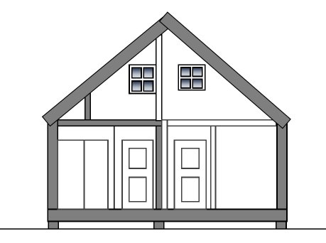 Начнем с самого простого АС 43, как можно догадаться, в 43 квадрата полезной площади. Итак, такой дом должен быть прост в строительстве и обслуживании, не прожорлив в отоплении и обладать минимумом для одного или двух – как повезет – этажника. И вот сейчас впору вернуться к проекту Архитектора Семена. Кто не знает, это полутораэтажный дом4 Х 7 м с общим залом и насестом для сна. Общей площадью между 30 и 40 квадратами, как доска ляжет. В лучших традициях канадско-американского охотничьего домика он рассчитан на одного отшельника, но может в случае нужды принять компанию до 3–4 человек. Удобства внутри. Кому интересно – обращайтесь к нему.