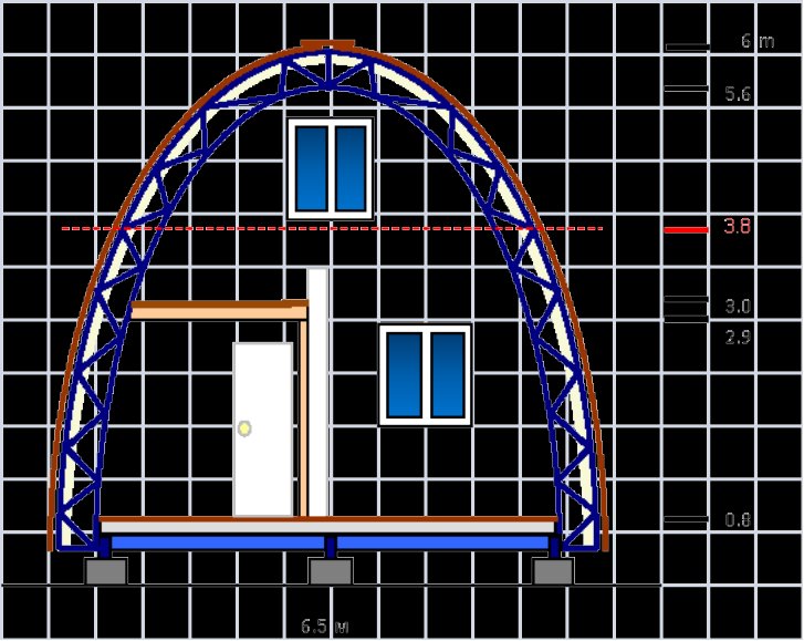 Вот такой дом то ли ангар, то ли бочка нарисовался на склоне. Для достижения простоты и универсальности, я вооружился принципом все по шесть метров, чтобы не пилить и не ошибиться поэтому. Кроме того, изрядно подустав от деревяшек, взялся за нелюбимые мной железо и пенопласт, типа неубиваемых германских промхолодильников, которые СССР закупил во множестве прям под занавес.