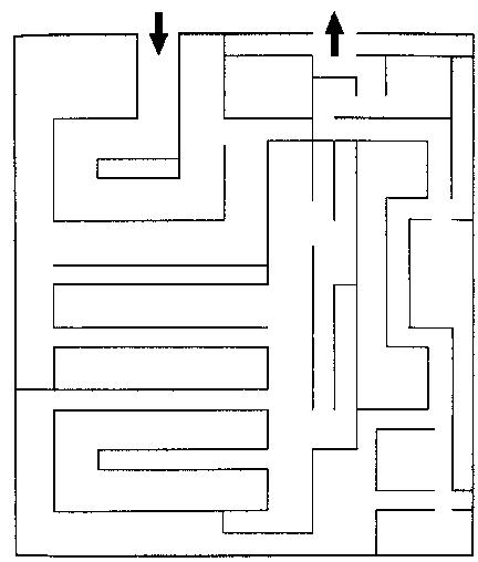 Упражнение выполняется в паре. Один из участников с помощью устных указаний-команд «заводит» своего партнера в воображаемый лабиринт, схему которого (рис. 8) он держит перед собой, но не показывает своему «ведомому». Всего используется три команды. Первая, обозначающая вход в лабиринт, — «Прямо!». Далее, в зависимости от формы лабиринта, следуют команды «Направо!» или «Налево!», после которых идущий по воображаемому лабиринту должен повернуть соответственно в правую или левую сторону. Пройдя лабиринт, «ведомый» должен развернуться на 180° и мысленно выйти из него, вслух сообщая обо всех перемещениях (посредством тех же трех команд). Все это время «заводящий» по схеме контролирует путь партнера. Если «ведомый» справился с заданием успешно, ему предлагается новый лабиринт с большим количеством поворотов и т. д. Затем партнеры меняются местами.