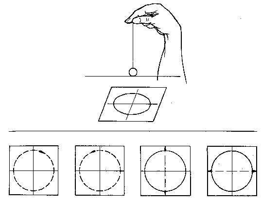 Задание. Опыт с маятником. Для того чтобы увидеть конкретное проявление идеомоторного акта, проведем небольшой опыт. Сделайте маятник из нитки длиной 15–30 см и небольшого предмета, например ключа, привязанного к одному концу нитки. Нарисуйте на листе бумаги круг, разделенный на четыре сектора двумя пересекающимися под прямыми углами линиями, как это показано на рис. 7. Если поставить локоть руки на стол и взять свободный конец нитки большим и указательным пальцами, то маятник будет совершать произвольное движение по отношению к кругу в том направлении, на котором вы сосредоточились. Вот вы представили себе движение маятника по часовой стрелке, по нарисованному на бумаге кругу (позиция 1). Висящий предмет действительно начинает такое движение, хотя вы держите конец нитки совершенно спокойно. Представьте себе предельно точно любое Движение маятника, сконцентрируйтесь на этом представлении (например, позиции 2, 3 или 4). Как бы спокойна ни была ваша рука, маятник начнет совершать ожидаемое движение.