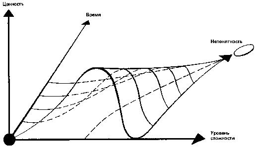 Как показано на графике, произведение искусства представляет собой сообщение, характеризуемое степенью сложности или количеством информации, причем эта характеристика, в свою очередь, зависит от культуры данного общества. Как показано на графике, ценность произведения меняется в зависимости от его сложности, следуя кривой, имеющей в какой-то точке максимум. Этот максимум в процессе исторического развития общества и роста его культуры смещается. В то же время он становится размытым в результате более равномерного распространения элементов культуры. Иначе говоря, общая эволюция искусства приводит к появлению все более уточненных и труднопонимаемых сочетаний элементов, т. е. того, что в каждую эпоху называют непонятным. Как здесь не согласиться со знаменитым высказыванием Гете: