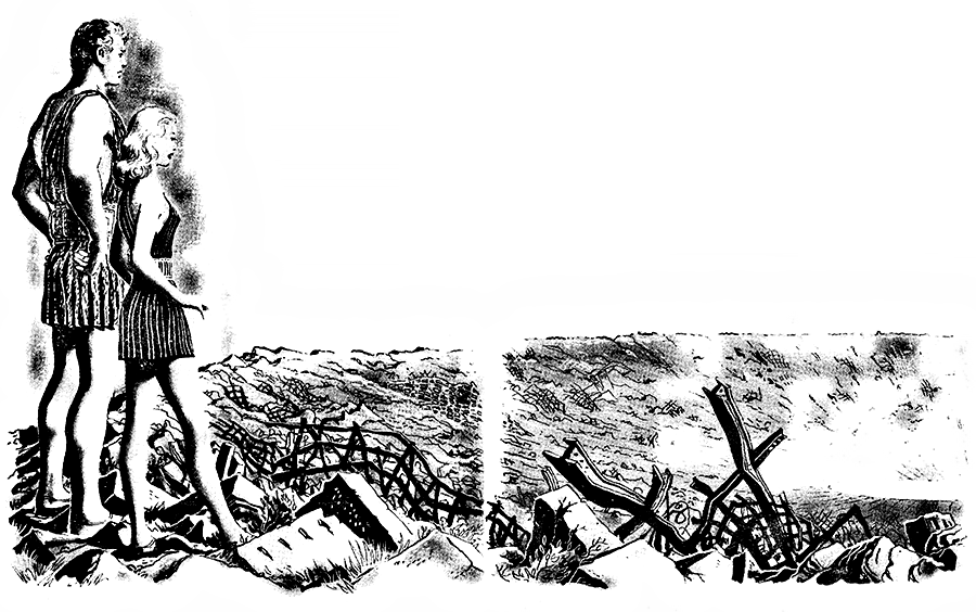 Ближе к полудню они приблизились к огромному искривленному хребту, сложенному из каменных глыб. В этом месте земля словно встала на дыбы, противясь неведомой силе и не желая вступать с ней в схватку. Когда они начали взбираться, Оссер ускорил шаг, и хотя Джубилит пришлось тяжело, она поняла, что близится конец и, стиснув зубы, старалась выдержать жесткий теми.
