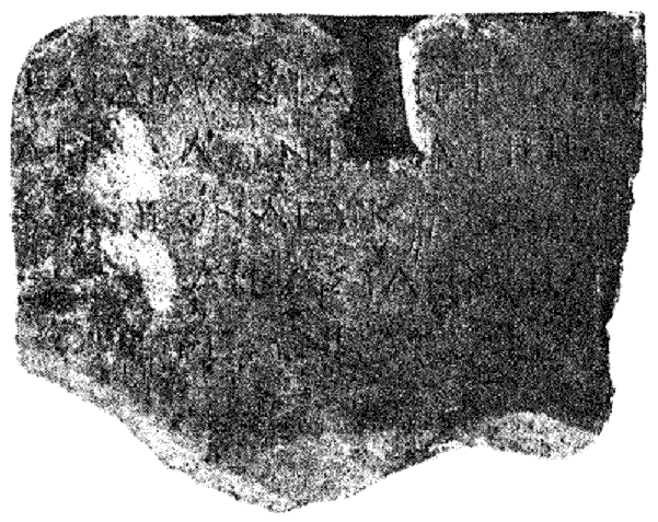Плита из глинистого сланца, ширина 0,60, высота 0,33, толщина 0,80, с четырехстрочной, надписью на боковой стороне. Выемки на верхней плоскости плиты говорят о том, что она служила постаментом статуи.
