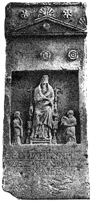 Дополнение первой строки, поврежденной, дано для примера. Число фигур на рельефе не соответствует надписи. По крупным буквам надписи, грубому рельефу и полному искажению архитектурного орнамента надгробие должно быть отнесено к концу I в. н. э.