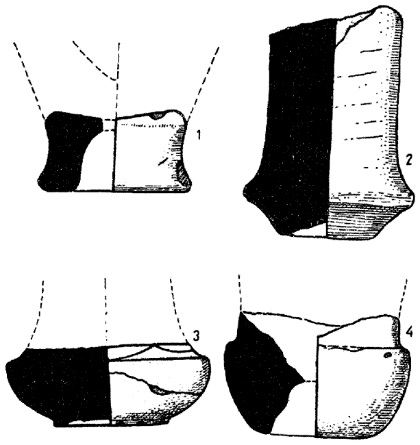 Различия наблюдаются и в очертаниях сосудов. Правда, основываясь на нашем материале, представляющем сплошь обломки, часто не дающие возможности восстановить форму сосуда, мы лишь очень осторожно можем об этом говорить. И, тем не менее, разница очевидна. Во второй нашей группе нет той четкости, выражающейся и в общих очертаниях, и в отдельных деталях формы, того, можно сказать, архитектурного строения сосуда, которое свойственно керамике аттической. Переходы одной части сосуда в другую в этой группе обыкновенно менее резко выражены, формы упрощены, они отличаются меньшим количеством таких деталей, как уступы, рельефные пояски и т. д. Вместе с тем этой группе свойственны определенные детали формы, не встречающиеся в другой группе и постоянно повторяющиеся в данной. Примером могут служить хотя бы подставки чашек и блюд. Если не считать поздних форм, упрощенных и выродившихся, основные разновидности подставок чашек и блюд той группы, о которой идет речь, сводятся к двум типам, воспроизведенным у нас на рис. 36, 3 (тип первый) и рис. 36, 4–6 (тип второй). Особенно характерным приходится считать второй наш тип, с выемкой на нижней части подставки. Среди елисаветовских находок 1928 г. мы четыре раза встречаем такую подставку — № 411, 441, 523 (см. рис. 36, 4–6) и 770; все эти четыре обломка относятся по своим техническим особенностям к только-что описанной группе. Просматривая находки, сделанные в том же Елисаветовском городище за предыдущие годы, мы и там встречаем целый ряд повторений тех же двух типов подставок, опять-таки в сочетании с упомянутыми техническими особенностями нашей второй группы.