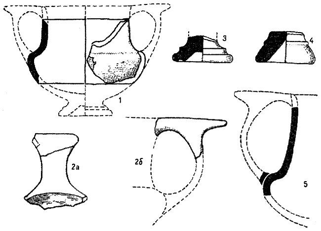 Как я уже указывала, обломков малоазийской чернолаковой керамики найдено в 1928 г. в Елисаветовском городище значительно больше, чем аттической, — свыше 90 экземпляров первой, около 20 — второй; здесь мы говорим, конечно, об экземплярах, определение которых не вызывает сомнений. Среди находок малоазийской группы также не было найдено ни одного целого сосуда; но по некоторым обломкам сосуд может быть восстановлен полностью, другие дают во всяком случае достаточно ясное представление о форме. Некоторые формы повторяются с большим постоянством. Я перечислю все главные типы сосудов, которые нам удается установить.