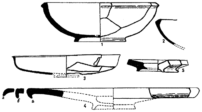 4. Чашки с крышкой и ручками (рис. 42, 1–4). Несмотря на значительное количество обломков, принадлежащих не менее чем 27 различным сосудам, форма не может быть восстановлена полностью; вполне ясна только верхняя часть. Внизу, судя по отдельным обломкам, по всей своей выделке очень напоминающим эти чашки, сосуд кончался плоским донышком без подставки. С наружной стороны эти чашки постоянно бывают покрыты копотью, иногда заходящей и на крышку, — по-видимому, в них приготовлялась пища прямо на огне. В соответствии с их назначением в качестве кухонной утвари, вся их выделка значительно проще и грубее, чем у других перечисленных типов; часто и глина хуже промыта, не так измельчена. Что касается разновидностей данной формы, то они определяются, по-видимому, прежде всего, глубиной чашки; иногда они очень мелки, и весь сосуд превращается в нечто вроде нашей сковороды, иногда (см., напр., 42, 4) сравнительно глубоки. Ручки, судя по найденным обломкам, всегда круглые в разрезе.