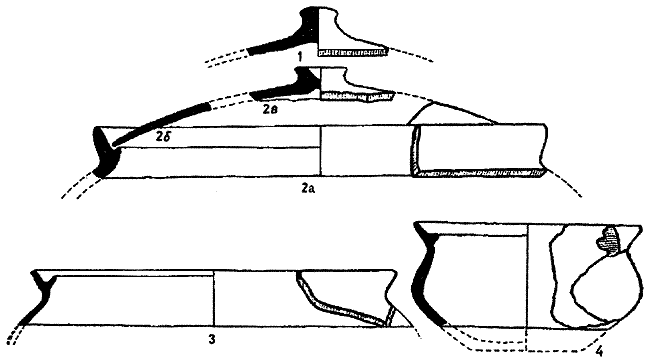 За исключением «чашки с крышкой» (тип 4-й), все перечисленные типы сосудов являются в основных своих чертах характерными для греческой керамики. В то же время следует отметить, что в данной группе наблюдается ряд особенностей, свойственных именно ей и отличающих ее от всех известных мне групп греческой керамики. Характерными чертами отличается, прежде всего, выделка сосудов. При очень тонких стенках, при известной претензии на особенно изящные и иногда вычурные очертания (ср. сильно изогнутые ручки кувшинов), бросается в глаза известная небрежность работы. Ручки часто бывают скошены вбок; кольцеобразная подставка имеет очертания очень упрощенные и даже грубые, резко отличающиеся от свойственных обычным типам керамики классической и раннеэллинистической эпохи четких контуров со стереотипно повторяющейся детализацией (выемки, выступы и т. д.). Характерна также техника передачи некоторых деталей формы. Так, обычно в греческой керамике профиль наружной стороны создается выгибом всей стенки, так что контур наружной стороны вполне соответствует контуру внутренней; здесь же такого соответствия нет, иногда даже применяются совсем необычные для античных сосудов приемы, когда, например, выступ стенки создается налеплением сверху полоски из глины (см. рис. 40, 3). Не встречает повторений в материале известных мне групп греческой керамики и глина со всеми ее перечисленными выше особенностями.