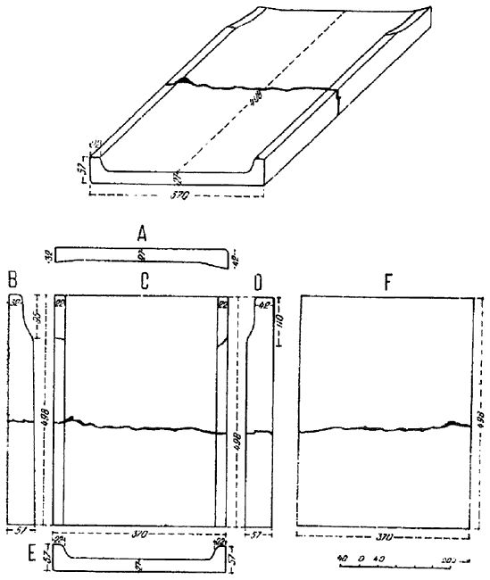 Рис. 67б. Боспорская черепица, найденная в Камыш-Буруне (перспективный вид, план, разрезы).