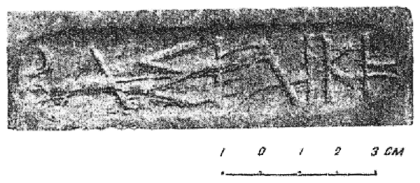 Но вот обращает на себя внимание группа клейм, на которых значится не одно имя, а два, причем целый ряд различных имен встречается в сочетании, по-видимому, с одним и тем же Перисадом. Так, имя Перисада в одном клейме стоит вместе с Гермократом (№ 67), в другом совместно с Пританом (№ 69). В указанных клеймах два имени расположены одно под другим, в две строки, причем имя Перисада написано с пропуском первой , т. е. в форме ; кроме этого, имеются еще клейма, где имя Перисада (в сокращенном виде ) находится в соединении с известным уже именем Гермократа (№ 21); в отличие от клейма типа № 67 последнее имеет несколько иную форму: оба имени в сокращенном виде написаны в одну строку. Несмотря на это внешнее различие, имеются все основания видеть в обоих случаях упоминание одних и тех же лиц.