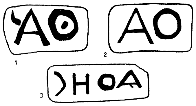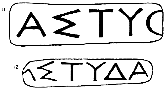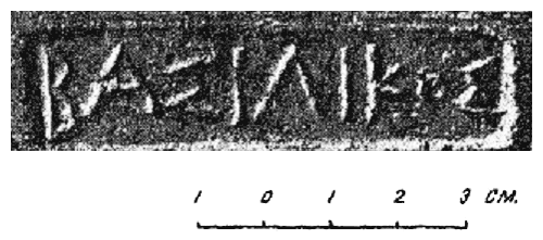 1, 2, 3 — — восстановление по Шкорпилу; возможно — , . В Керч. музее клейм формы № 1 — 5 экз., ф. № 2 — 2 экз., ф. № 3 — 1 экз. Орешников у Гиля, стр. 41, № 20 (ф. № 2); Шкорпил, 1903-5, № 454 (ф. № 3). Клеймо ф. № 3 было найдено в 1894 г. в Феодосии, см, Юргевич, ЗОО, XVIII, стр. 167, № 5.