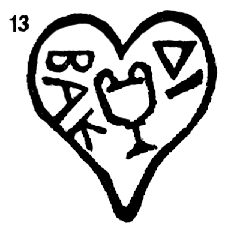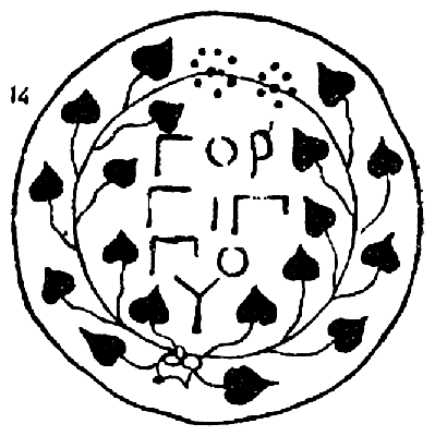13 — — восстановление по Шкорпилу. Клеймо энглифическое, с эмблемой в виде изображения камфара. В Керч. музее — 8 (7/1) экз. Шкорпил, 1906-7, № 807. 1 экз. такого же клейма имеется в материалах Таманской экспедиции ГМИИ, найден в Фанагории.