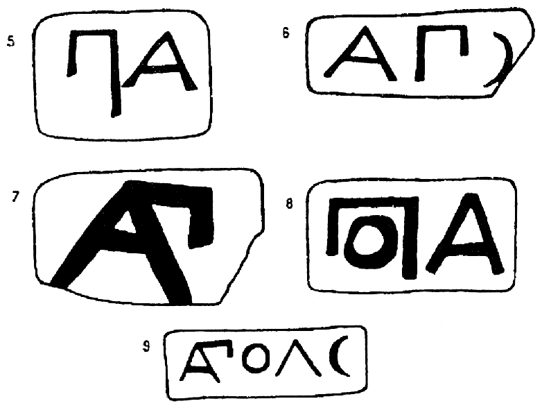 5, 6, 7, 8, 9 — — восстановление по Шкорпилу; предполагается Аполлоний, сын боспорского архонта Левкона, упоминаемый в афинском декрете от 347/6 г., посвященном сыновьям Левкона (Minns, стр. 651, 28). В Керч. музее клейм ф. № 5 — 7 (5/2) экз.; ф. № 6 — 8 экз.; ф. № 7 — 2 экз.; ф. № 8 — 5 экз.; ф. № 9 — 2 экз. Орешников у Гиля, стр. 41, № 15; Шкорпил, ИАК, 3, стр. 162, № 1 (ф. № 9); Шкорпил, ИАК, 11, стр. 154, № 693а (ф. № 6), 693б (ф. № 8). Клеймо ф. № 5 было найдено в 1894 г. в Феодосии, см. Юргевич, ЗОО, XVIII, стр. 167, № 4.