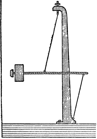 Сейсмограф — это обычно горизонтальный стержень с грузом на свободном конце. За середину он подвешен к верхней части стойки, а за один из концов прикреплён нитью к её основанию. Так стержень висит горизонтально, поддерживаемый в пространстве двумя нитями (рис. 6).