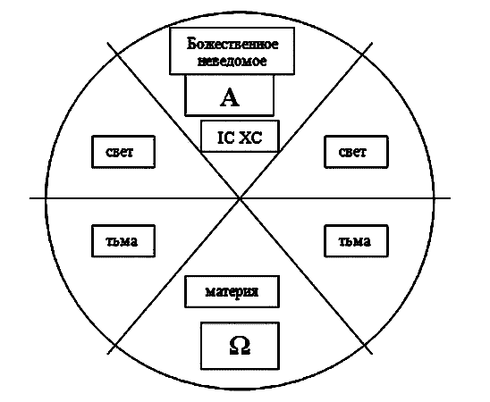 — Это образ Вселенной — и духовной и материальной в совокупности. После грехопадения мир имеет в точности такое устройство. Круга нет, он изображён условно. В действительности за пределами круга — бесконечность. Каждая из частей уходит в бесконечность, понял?