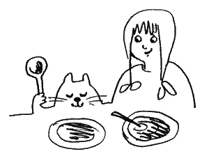 Мне стало стыдно, что я его супом не угощаю, и я поскорее перелила почти весь свой суп в его мисочку. Кот стал есть суп — да так вкусно причмокивал и примурлыкивал, что мне тоже есть захотелось. И я все доела, что у меня в тарелке оставалось.