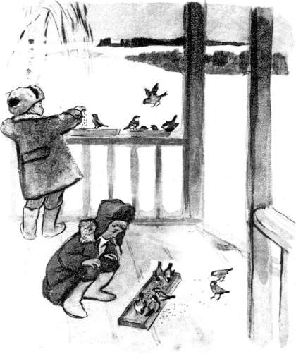 Каждый день,Когда встаем,Мы с братишкою вдвоём,Взяв крупыИ хлебных крошек,На крыльцо бежим скорей.Много ласковых,ХорошихПрилетают к нам друзей.На кормушке сидя,ПтицыЧистят клювики свои.Тут щеглы,Чижи,СиницыИ проныры-воробьи.Ждут нас так же терпеливоИ красавцы снегири…Все привыкли,Не пугливы,Хоть руками их бери!