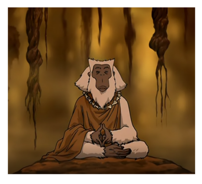 «Ом-м-м», — услышал Аанг где-то неподалёку и заметил на возвышенности истинную обезьяну с белой шерстью. Дух сидел в позе медитации и был одет в маньи, а на его шее висело ожерелье из каких-то цветов.