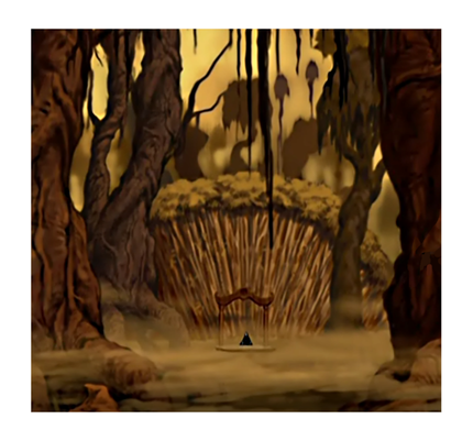 Он сидел в позе лотоса на деревянном круге, за спиной на крошечном островке суши стояли тории знакомой конфигурации. За ними вместо зелёного бамбука, который был в оазисе Духов, густо росли похожие тонкие стволы, но каких-то деревьев. Всё остальное тоже сильно отличалось: вместо оазиса и ледяного города вокруг простиралось жёлто-коричневое болото с редкими сухими местами, на которых располагались исполинские узловатые стволы с редкой листвой. Пролетали какие-то странные птицы и, в общем, мир духов производил гнетущее впечатление. Тут и правда могло быть опасно. Аанг решил перелететь на один из сухих островков и плюхнулся в коричневую жижу.