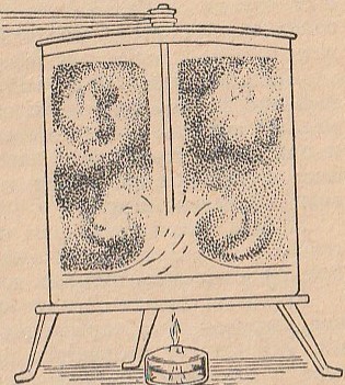 Давно допытывались ученые, какие причины вызывают смерчи. Много высказывалось различных предположений. Один французский ученый решил сделать смерч собственными руками. Он налил воды на дно небольшой стеклянной банки, плотно закрыл ее и пропустил через крышку стеклянную палочку. После этого он стал подогревать воду на спиртовой горелке. Как только внутри закрытой банки начали образовываться водяные пары, ученый с помощью маленького моторчика стал быстро вращать стеклянную палочку. Вокруг этой палочки сразу же образовался столбик тумана. Это охладившиеся частички пара, находящиеся рядом с палочкой, вращались вместе с ней. Так ученый получил первую, верхнюю, часть смерча – смерчевый «хобот», опускающийся к земле или воде из грозового облака. Оставалось получить нижнюю часть смерча. Для этого ученый, продолжая вращение стеклянной палочки, стал медленно опускать ее к воде. Как только палочка приблизилась к воде, вода вскипела и поднялась маленьким столбиком навстречу туманному столбу. Искусственный смерч был получен (рис. 22).