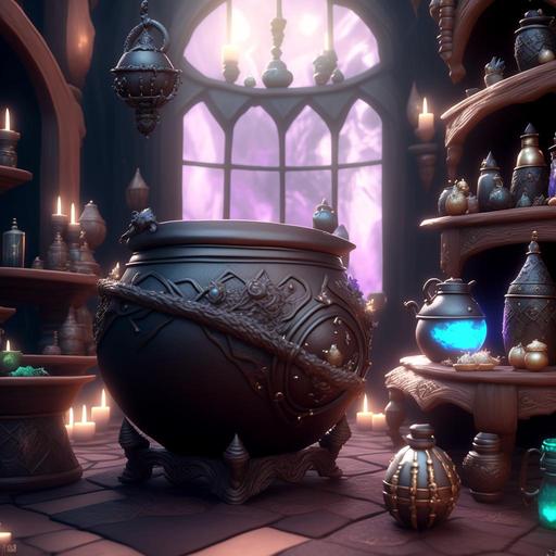 Стена идёт рябью, а потом и вовсе пропадает, а за ней открывается другая комната, чем-то похожая на погреб Фисса. Всюду колбы, бутыльки и большой закопчённый котёл по центру.