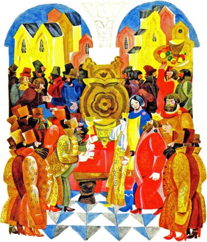 Тут князь Владимир да княгиня Апраксия принялись Алёшеньку чествовать, жаловать: отписали, пожаловали город с пригородками, наградили большим селом с присёлками. «Золоту казну держи понадобью, мы даём тебе одёжу драгоценную!»