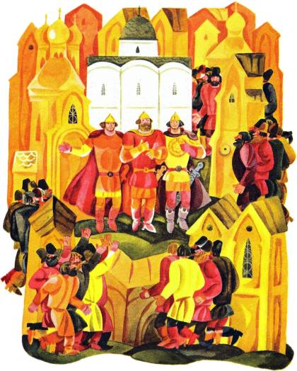 А Владимир-князь по столовой по палате похаживает да приказывает: «Отроки, слуги верные, наливайте чару зелена вина да разбавьте медами стоялыми, не малую чару — полтора ведра, подносите чару Алёше Поповичу, другу чару поднесите Илье Муромцу, а третью чару подавайте Добрынюшке Никитичу». Подымались богатыри на резвы ноги, выпивали чары за единый дух да меж собой побратались: старшим братом назвали Илью Муромца, средним — Добрыню Никитича, а младшим братом нарекли Алёшу Поповича. Они три раза обнималися да три раза поцеловалися.